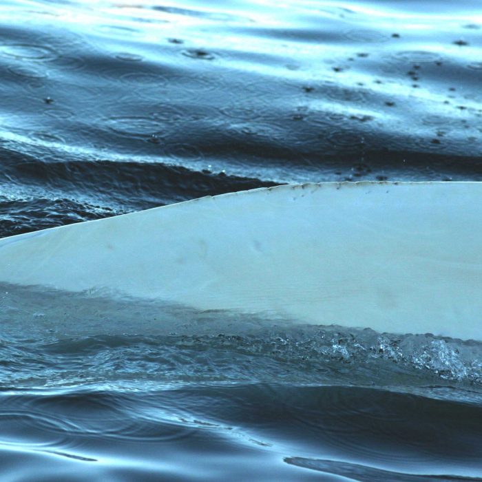- Small, wide-based and falcate dorsal fin; two-thirds down the back.